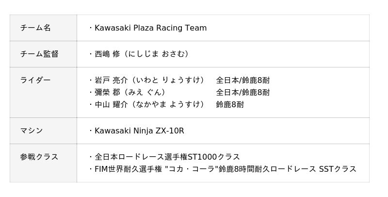 全国のカワサキ プラザ店、カワサキファンの皆様と共にモータースポーツの感動や喜びを共有することを目的とし、「FIM世界耐久選手権 "コカ・コーラ"鈴鹿8時間耐久ロードレース SSTクラス」、「全日本ロードレース選手権ST1000クラス」へ参戦しています。