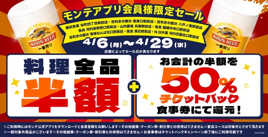 「白木屋」「魚民」「目利きの銀次」などを全国に展開する株式会社モンテローザ(本社:東京都杉並区、代表取締役:大神輝博)は、地域で一番愛される店舗づくりに日々努めてまいりました。この度、モンテアプリ会員様限定で大阪・兵庫の対象9店舗にて「料理全品半額」&「半額チケットバック」キャンペーンを実施いたします。