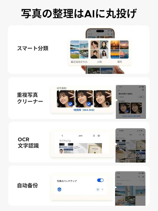 保存したデータを整理整頓してくれる「AI写真分類機能」も秀逸。顔を識別し、人物ごとに自動でアルバムを作成。必要な写真を瞬時に探せて便利です。レシートや契約書の画像から金額や日付が調べられるOCR(テキスト認識)機能のおかげで業務効率もアップすること間違いなしです。