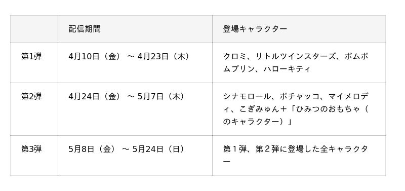 第2弾には、シナモロール、ポチャッコ、マイメロディ、こぎみゅんに加えて、「ひみつのおもちゃ」が登場し、この「ひみつのおもちゃ」にも専用のステージが用意されています。どのキャラクターが登場するかは、箱を開けるまでのお楽しみ!ぜひ、お手元でワクワクしながら確かめてみてください。