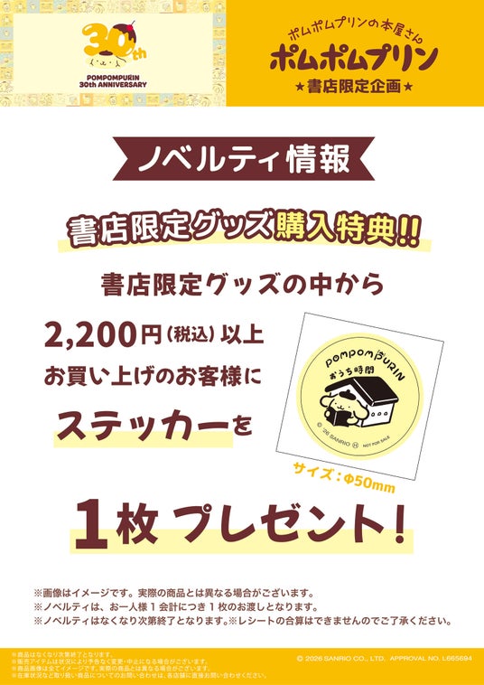 「ポムポムプリン30th記念 ポムポムプリンの本屋さん3」書店限定グッズを2,200円(税込)以上お買い上げのお客様に「ステッカー」を1枚プレゼントいたします。