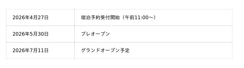 2026年5月30日(土)のプレオープンを記念し、公式サイト限定で「プレオープン記念プラン」の販売を開始します。本プランでは、プレオープン期間の2026年5月30日(土)~7月10日(金)までのご宿泊分を対象に、お一人さま税込7,700円~(夕朝食別)の特別価格でご利用いただけます。