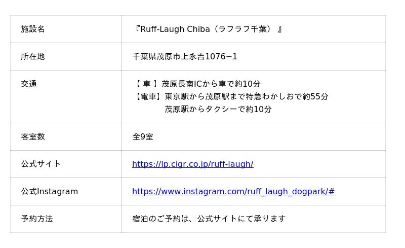 『Ruff-Laugh Chiba(ラフラフ千葉)』は、「ライフスタイル・ドッグパーク」をコンセプトに、イヌもヒトも自由に過ごせる、理想のライフスタイルを提案する施設です。都心から約1時間というアクセスの良さを活かし、移動の負担を抑えながら、日帰りでその日を思い切り楽しむことも、宿泊してゆっくりと過ごすこともできる、新しいドッグパーク体験を提供します。