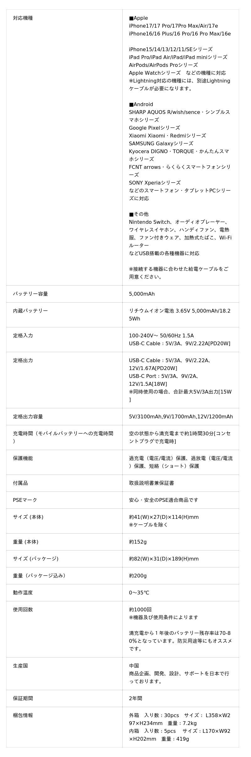 モバイルバッテリー 5,000mAh PD20W対応 USB-C入出力 ACコンセント一体型 PSE適合製品 2年保証(MOT-MBAC5001)