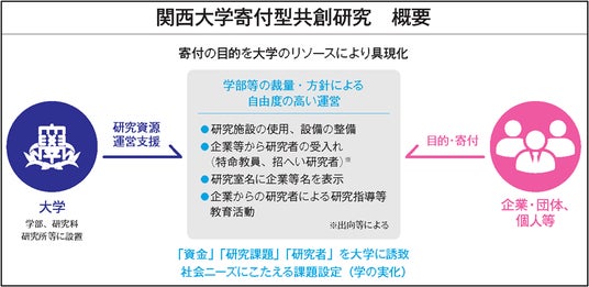 「寄付型共創研究制度」は学部等の裁量・方針のもとに、企業等からの寄付で研究室を立ち上げ、当該企業等から本学に研究者を迎え入れることも想定しています。企業の事業としては展開が難しい長期的なテーマや社会的課題について、大学の知見・人材・設備といったリソースを活用して取り組むことを目的とします。