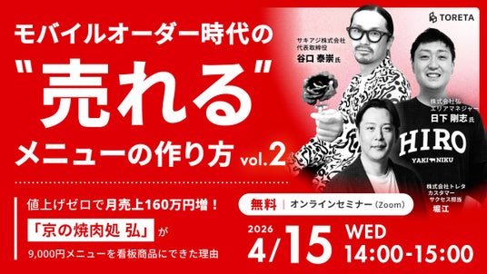 株式会社トレタ(本社:東京都渋谷区、代表取締役 CEO:中村 仁)は、2026年4月15日(水)にオンラインにて「モバイルオーダー時代の“売れる”メニューの作り方 vol.2」セミナーを開催いたします。メニューブックデザインの第一人者・サキアジ株式会社 代表取締役 谷口 泰崇氏と、実際にモバイルオーダー「トレタO/X」を導入し成果を上げた株式会社弘(https://yakiniku-hiro.com/)が運営する「京の焼肉処 弘」の現場担当者が登壇し、値上げに頼らず売上・客単価を伸ばした実践事例を詳しくお伝えします。