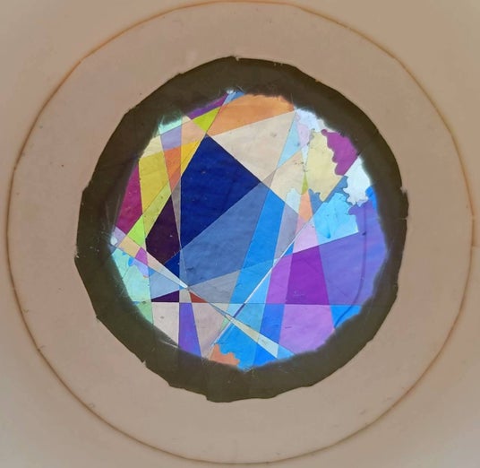 見た目はただの黒いシートですが、完成品を光にかざすとカラフルな模様が浮かび上がります。
