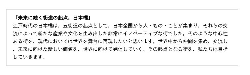 三井不動産では「残しながら、蘇らせながら、創っていく」を開発コンセプトに、官民地域一体となった「日本橋再生計画」を推進しています。「産業創造」「界隈創生」「地域共生」「水都再生」の 4つのキーワードに基づいたハードとソフトの融合した街づくりを通して、賑わいの再生に取り組んでまいりまし た。2019 年には「日本橋再生計画第 3 ステージ」を発表し、「共感・共創・共発」の考え方のもと、「豊かな水辺の再生」「新たな産業の創造」「世界とつながる国際イベントの開催」の3つを重点構想として推進し、「未来に続く街道の起点、日本橋」というビジョンを実現するための街づくりを推進していきます。