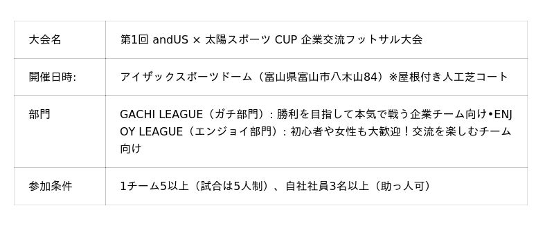 株式会社andUS(本社:富山県富山市、代表取締役社長:廣岡伸那、以下「アンダス」)と株式会社太陽スポーツが2026年5月16日(土)に共同開催する「第1回 andUS × 太陽スポーツ CUP 企業交流フットサル大会」において、大会をさらに盛り上げる豪華賞品の詳細が決定いたしました。また、現在参加を予定している富山県内の有力企業の一部を公開いたします!