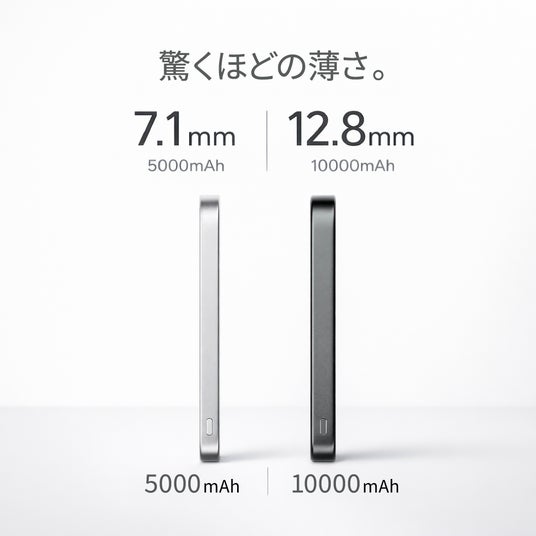 これにより、頼もしい容量はそのままに、5000mAhモデルを7.1mm、10000mAhを12.8mmの驚くほどの薄型・軽量化を叶えました。