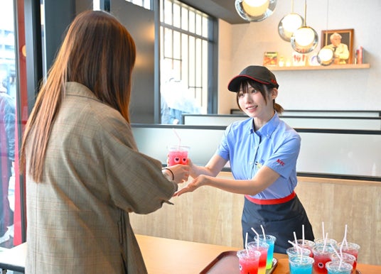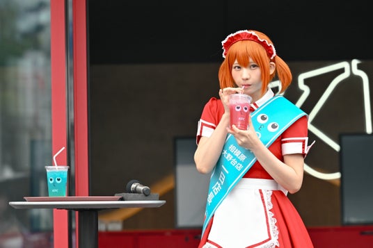 1日店長のえなこさんがKFCイメージの特別衣装で登場! “ちゅるん”食感のゼリードリンク「ちゅる~りぃ」を試飲! KFC次世代モデル店舗 相模原大野台店がテープカットで華やかにオープン!