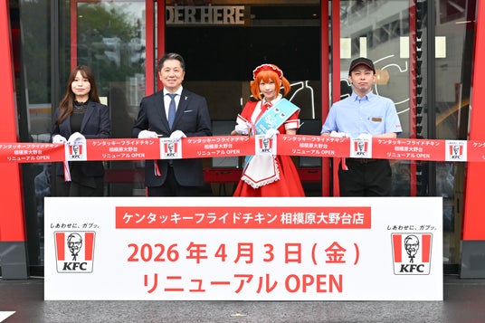 日本ケンタッキー・フライド・チキン株式会社(社長:名嶋 篤史、以下:日本KFC)は、4月2日(木)に「KFC 次世代モデル店舗 相模原大野台店 オープニングセレモニー&新商品『ちゅる~りぃ』発表会」を開催しました。イベント当日は、遠藤CEOが次世代モデル店舗「相模原大野台店」の特徴について紹介したほか、商品開発担当者より新商品「ちゅる~りぃ」について説明しました。さらに、人気コスプレイヤーのえなこさんがゲストとして登場し、「1日店長」就任セレモニーや新商品の試飲、テープカットなどを行い、会場を華やかに彩りました。