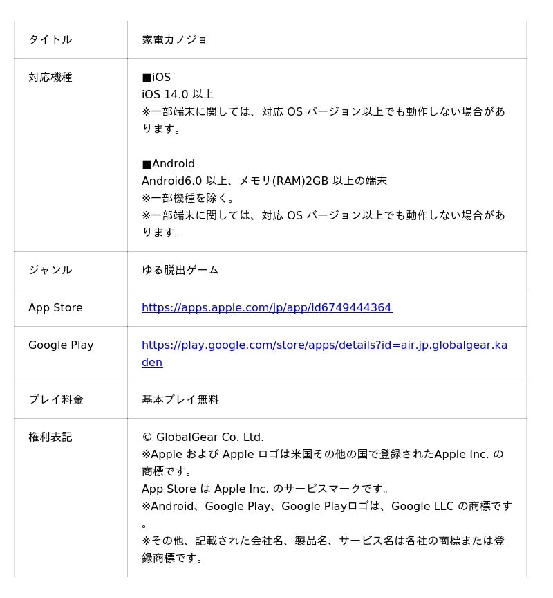 株式会社グローバルギア(本社:福岡県福岡市、代表取締役:佐藤竜史、以下「グローバルギア」)は、新作カジュアルゲーム『家電カノジョ』をApp Store、Google Playで提供開始したことをお知らせします。