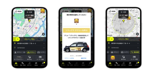 期間中は、「リラックマ」「コリラックマ」「キイロイトリ」「チャイロイコグマ」がそれぞれデザインされた4種類の車両が都内を走行します。タクシーアプリ「S.RIDE」から対象車両の指定配車が可能で、アプリ上の配車画面にはそれぞれのラッピングデザインに合わせた限定アイコンが表示されます。