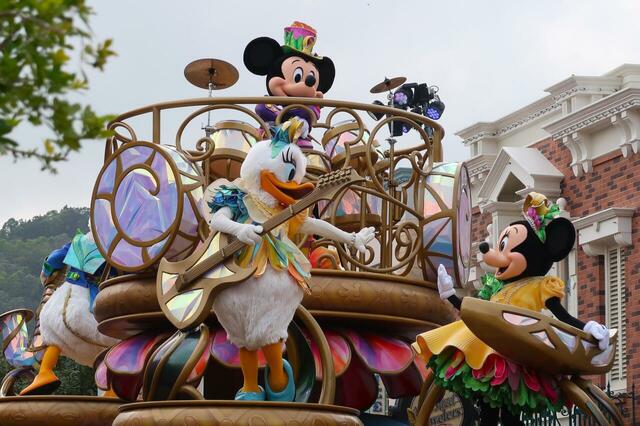 先頭は楽器を演奏しているミッキー、ミニー、デイジー、ドナルド、グーフィーのフロート。