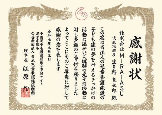 株式会社MIRAIASU「ミライアス」(本社:東京都台東区、代表取締役:波多野良太郎、以下「当社」)は、2026年4月1日より東京エリアで貴金属買取事業「ことちゃん」のテレビCM放送を再開したことをお知らせいたします。あわせて、代表取締役の「どうしても子どもたちの未来につながる活動をしたい」という強い想いのもと、公益財団法人 日本児童養護施設財団への寄付を実施し、このたび感謝盾を受領いたしました。