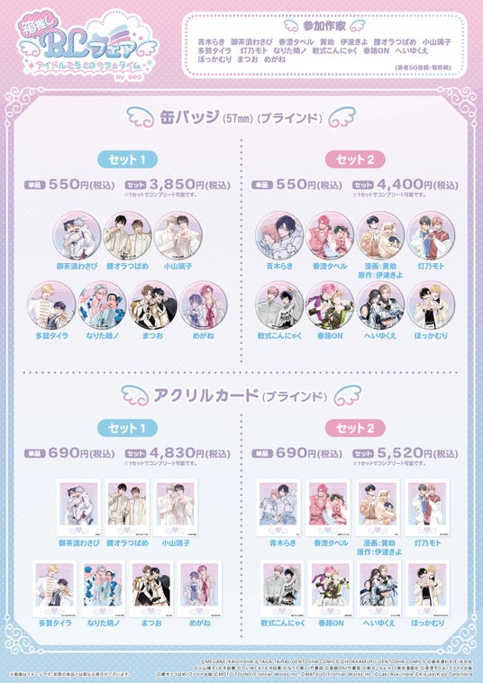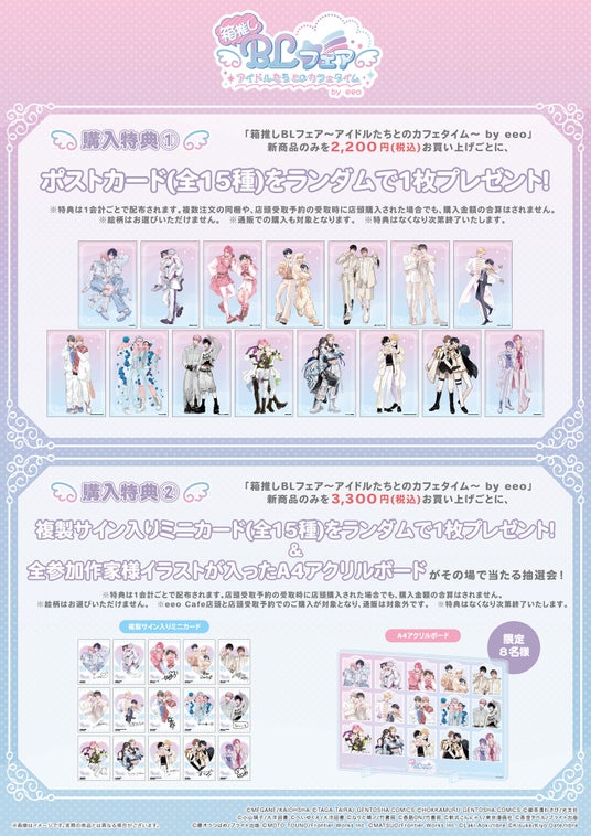 「箱推しBLフェア~アイドルたちとのカフェタイム~ by eeo」の新商品のみを1会計2,200円(税込)お買い上げごとに、ポストカード(全15種)を購入特典としてランダムで1枚プレゼントいたします。