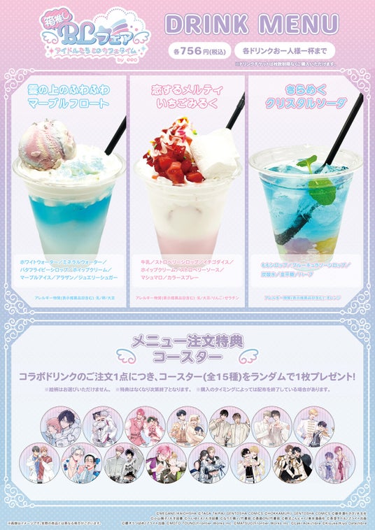 “推しカプのアイドルに会えるカフェがあったら……”という気持ちをさらに盛り上げるコラボドリンク(全3種)が登場! コラボメニューのご注文1点につき、メニュー注文特典としてコースター(全15種)をランダムで1枚プレゼントいたします。