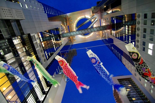 梅田スカイビルならではの巨大な吹き抜けを力強く泳ぐ鯉のぼり。