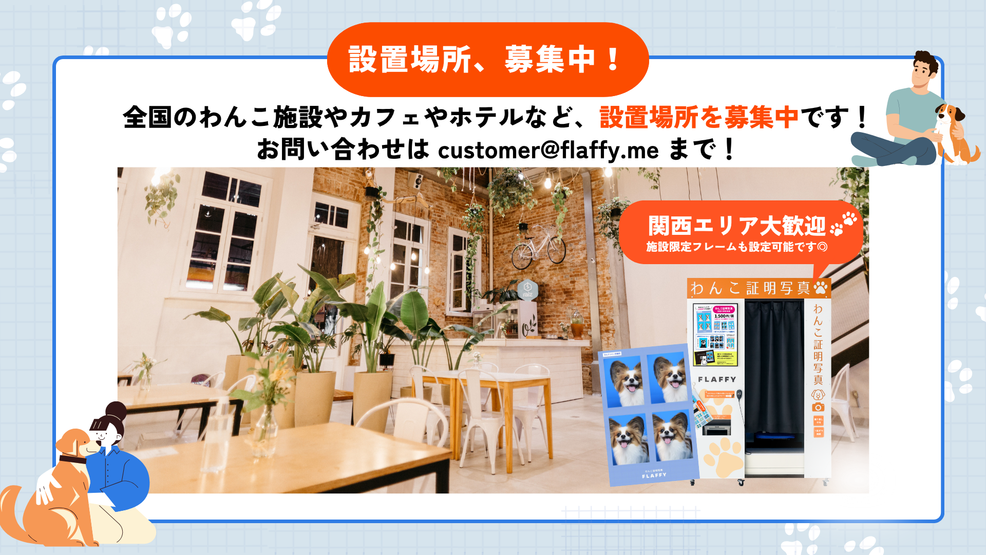 全国のわんこ施設・カフェ・ホテルで『わんこ専用証明写真機』の設置場所を募集中!特に関西エリアは未出店のため大歓迎です。今後は全国に常設スポットを広げていきます。