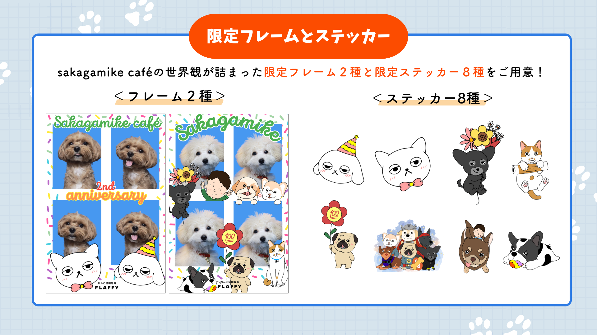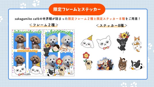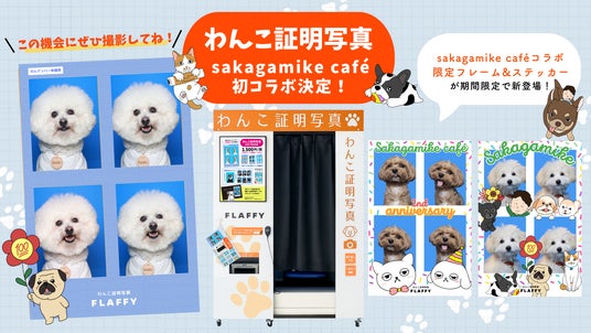 “イヌとヒトの関係をフラットに” をコンセプトに、国内最大級の犬情報メディア事業や人間の服を愛犬の服にリメイクするサービスを展開する株式会社FLAFFY(本社:東京都中野区、代表取締役:廣田 智沙/以下 当社)は、大好評の愛犬の証明写真が撮影できる『わんこ専用証明写真機』において、保護ハウス「さかがみ家」が運営する「sakagamike cafe」常設店オープンの2周年を記念し、このたび初めてコラボレーションを実施いたします。本コラボでは、限定フレーム2種とステッカー8種をご用意。2026年4月25日からの期間限定で、特別仕様の『わんこ証明写真』をお楽しみいただけます。