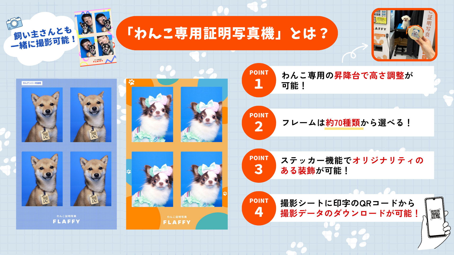 「わんこ専用証明写真機」は、FLAFFYが独自で企画・展開するわんこ専用のセルフ撮影機です。人間用の証明写真機と同じ操作感で、愛犬の“今”を楽しく、高クオリティで気軽に撮影できます。約70種類以上から選べるフレームや、オリジナリティある装飾が可能なステッカー機能、QRコードによる撮影データのダウンロードなど、思い出づくりをサポートする工夫が詰まった新しい体験型コンテンツです。
