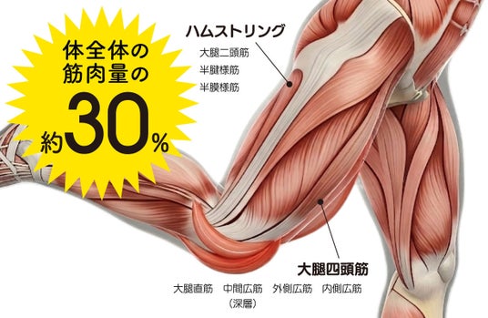 そして、これらの太ももの筋肉は、体全体の筋肉のうち、なんと約30%の筋肉量を占めています!