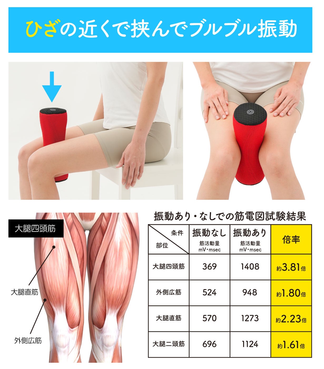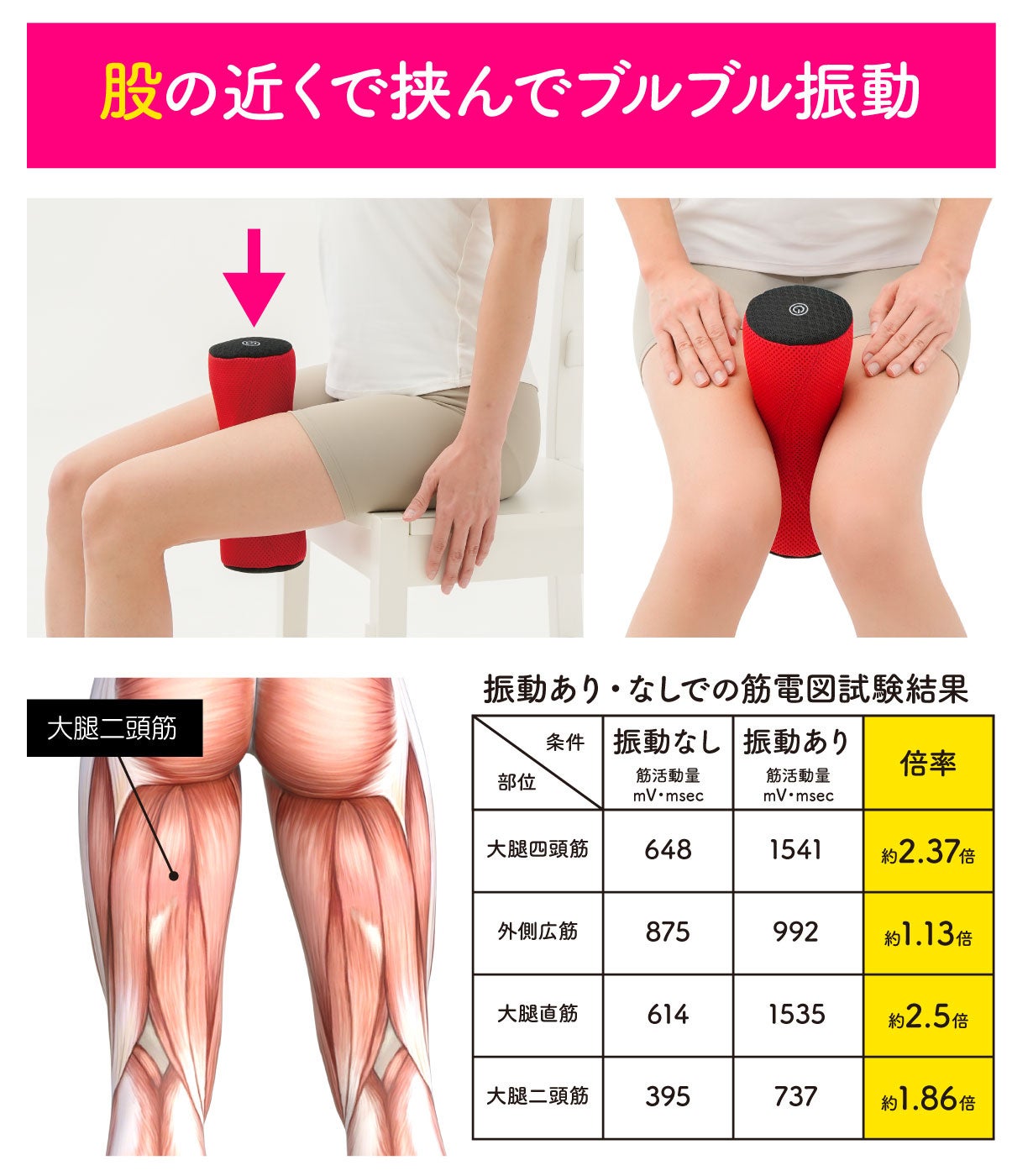 ※成人女性(49歳、身長159cm、体重54kg)が本品を股およびひざ付近に挟んだ状態で、振動あり・なしの条件における筋電図測定を実施。(試験番号NoS25-04994-2/2026年3月3日・ボーケンガーメンテック株式会社調べ)
