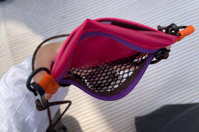 表面は小銭や鍵をパッと確認できる、ジップ付きのメッシュポケット。そして裏面は、ベルクロ(マジックテープ)付きのポケットに。