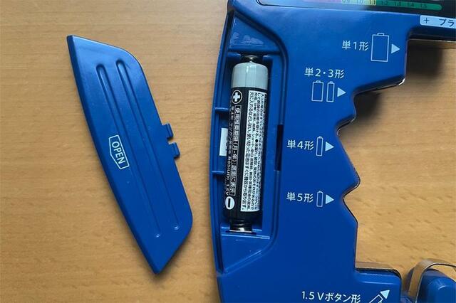 乾電池をセットするだけで、残量が液晶画面に18段階で表示されるというもの。単1から単5電池と1.5Vのボタン電池(LRのみ)に対応しています。