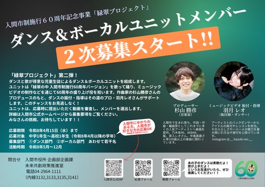 本プロジェクトのプロデュースは、数々のヒット曲を手掛ける作曲家の杉山勝彦さんが担当。ダンスの振付・指導は、プロダンサーの羽月レオさんが強力にサポートします。結成されたユニットは、ミュージックビデオの制作や各種イベントでのパフォーマンスを通じて、市制施行60周年を華やかに彩ります。募集の概要