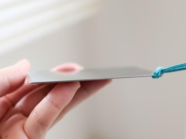 そのままだと指紋がつきやすそうにも見えますが、このミラーには紐が付いているので、そこをつまめば鏡面に触れずに扱えます。