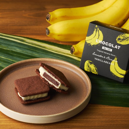 生チョコレートのクッキーサンド「ショーコラ」の限定フレーバー。口に入れた瞬間に広がるバナナの香りと味わいに加え、エクアドル産カカオのフルーティーな香ばしさのバランスが絶妙です。