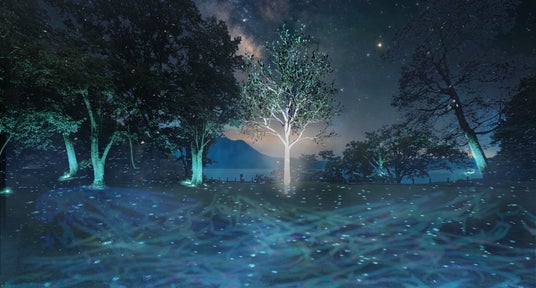 支笏湖のほとりに広がる森では、自然との響き合いをコンセプトとしたプロジェクションマッピングが展開され、ギタリスト・音楽プロデューサーの鳥山雄司さんが手がけた音楽とともに、幻想的な空間を創り出します。