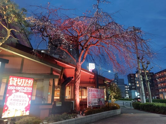 ★今だけのフォトスポットにも★店舗前に佇む枝垂桜は、今回のリニューアルの象徴。 夜間には淡いピンクのライトで照らし、歩道からも楽しめる“夜桜スポット”として生まれ変わりました。