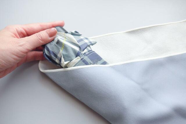 まずは、ポケット部分に折りたたみ傘を差し込みます。