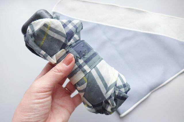 吸水性はどれぐらいあるのかな? と気になり、びしょびしょに濡れた折りたたみ傘をしまってみました。