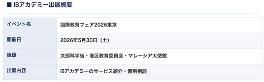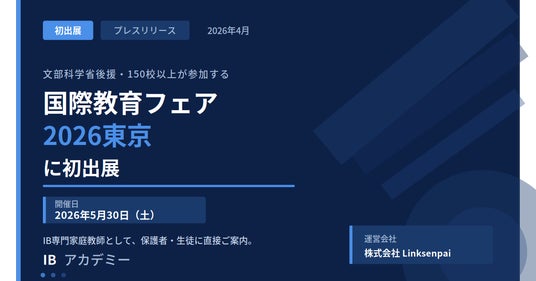 株式会社Linksenpai(所在地:東京都渋谷区、代表取締役:吉田志織)が運営するIB(国際バカロレア)専門オンライン家庭教師サービス「IBアカデミー」は、2026年5月30日(土)に開催される「国際教育フェア2026東京」に初めて出展することをお知らせします。文部科学省後援のもと、国内外150校以上が参加する国際教育の大型イベントにおいて、IB専門家庭教師サービスとして保護者・生徒の皆様に直接サービスをご紹介します。