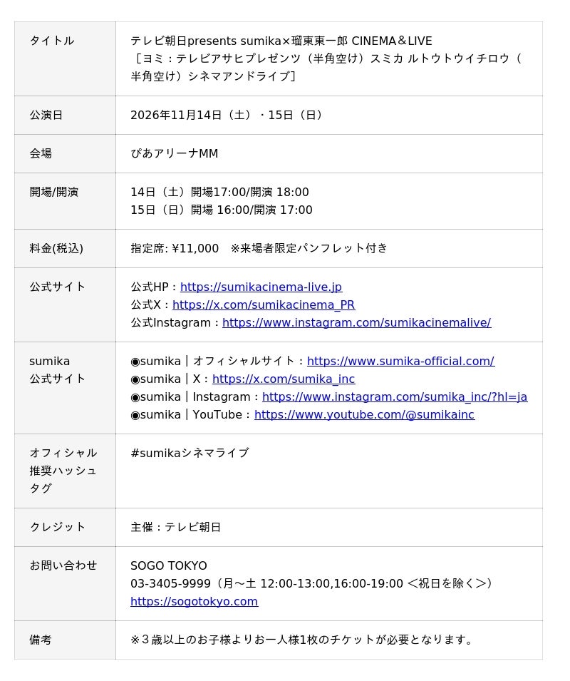「sumika×瑠東東一郎 CINEMA&LIVE」の開催が決定しました。