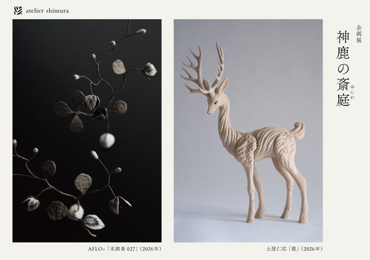 アトリエシムラ(東京都世田谷区、代表:志村昌司)は、4月17日(金)から29日(水・祝)まで、彫刻家・土屋仁応氏とアフロプリュス(AFLO+)の皆川眞弓氏を迎えた企画展「神鹿の斎庭(ゆにわ)」を開催します。