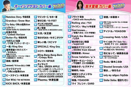 これまでデュエットも含め、60曲以上のアニソン神曲をカバーしてきたオーイシマサヨシと鈴木愛理。中でも、鈴木愛理がカバーした「アイドル(YOASOBI)」をはじめ、1000万再生を超える“伝説カバー”も多数誕生!またオーイシマサヨシと鈴木愛理がコラボした「secret base~君がくれたもの~(ZONE)」では、“番組リニューアル前最後の歌唱”ということで感極まった鈴木愛理を、オーイシがサポートして歌唱するシーンが大きな話題に!