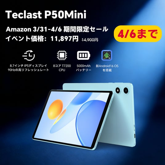 タブレットメーカーのTeclastが販売している、「Android 16」を搭載した8.7インチAndroidタブレット『Teclast P50Mini』について、2026年3月31日から4月6日までの期間中、通常価格より20%OFFの大幅割引が適用された期間限定キャンペーン価格11,897円(税込)で購入できます。