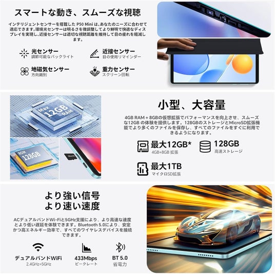 TECLAST P50 Mini タブレット は8.3mm の薄さ、重量約368gで、ポータブルなオールメタルデザイ、片手で握りやすい8.7インチタブレットです、仕事・勉強・外出先など、持ち歩きにも便利です。