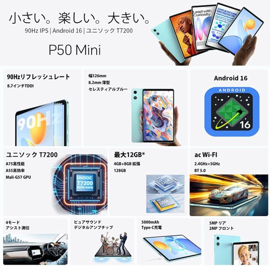 『Teclast P50Mini』は、Android 16や90Hzの高リフレッシュレートや大容量バッテリーなど、日常使いに欲しい要素をバランス良く備えた片手で握りやすい8.7インチタブレットです。仕事・勉強・外出先など、持ち歩きにも便利です。Amazonリンク