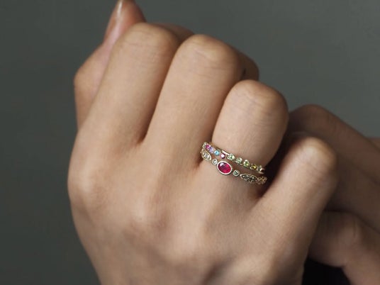 ルビーには、肌になじみやすいK10ピンクゴールドを合わせ、やわらかな艶を引き出しております。ブルーサファイアは、K10イエローゴールドとホワイトゴールドの2種類をご用意し、合わせる地金によって青の見え方にわずかな違いが生まれ、表情に奥行きをもたらします。