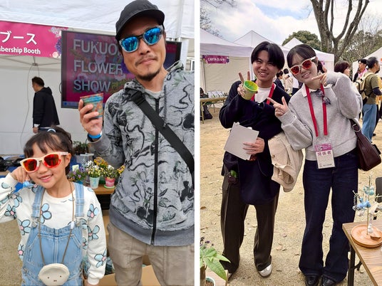 Fukuoka Flower Show 2026のブースで記念撮影する親子。5日間で多くの家族連れが立ち寄った