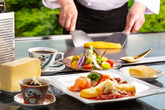目の前で焼き上げる、シェフのパフォーマンスが目にも楽しい鉄板焼コース。ワインの品揃えも豊富な優雅で贅沢なディナータイムはいかがですか。厳選された食材の旨みを引き出す一品、美味しい音と香り、シェフとの会話もごちそうです。金箔はちみつや能登大納言餡が嬉しい加賀パンケーキのアフタヌーンティー、ハッピーアワー、貸切風呂、伝統芸能・山中節の夕べ、加賀プリンほか多彩な無料サービスがご滞在に彩を添えます。