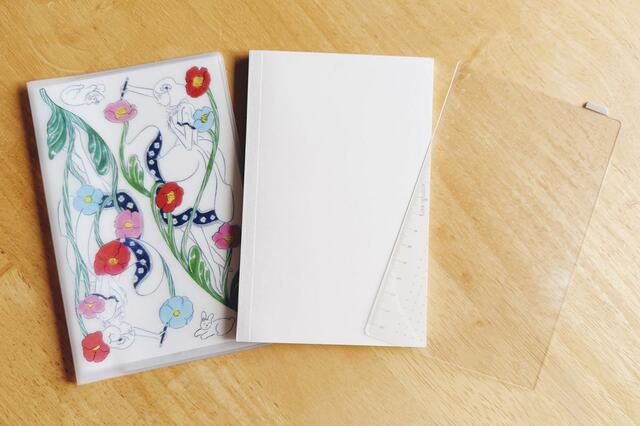 ノート本体、ポケット付き専用カバー、定規やしおりとしても使える下敷きの3点セットになっています。