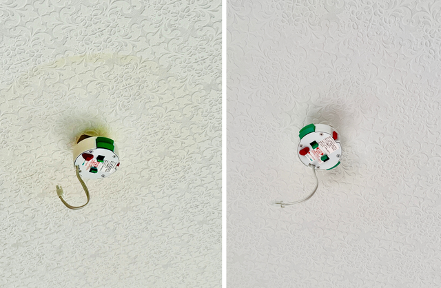 筆者も平成感あふれるシーリングライトをお洒落な照明に取り替えようと取り外してみたところ……。見事な天井焼けを発見。絶望感のなかで、こちらのアイテムを発見しまして、早速試すことに。