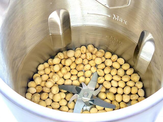 底についたステンレスの10枚刃が、大豆を粉砕